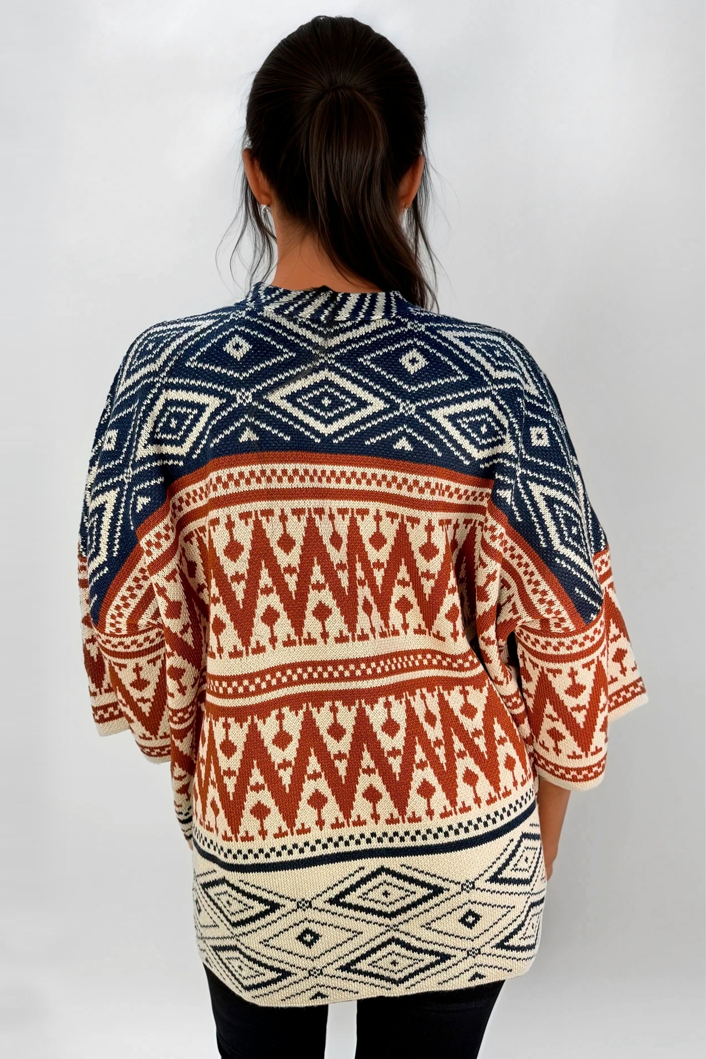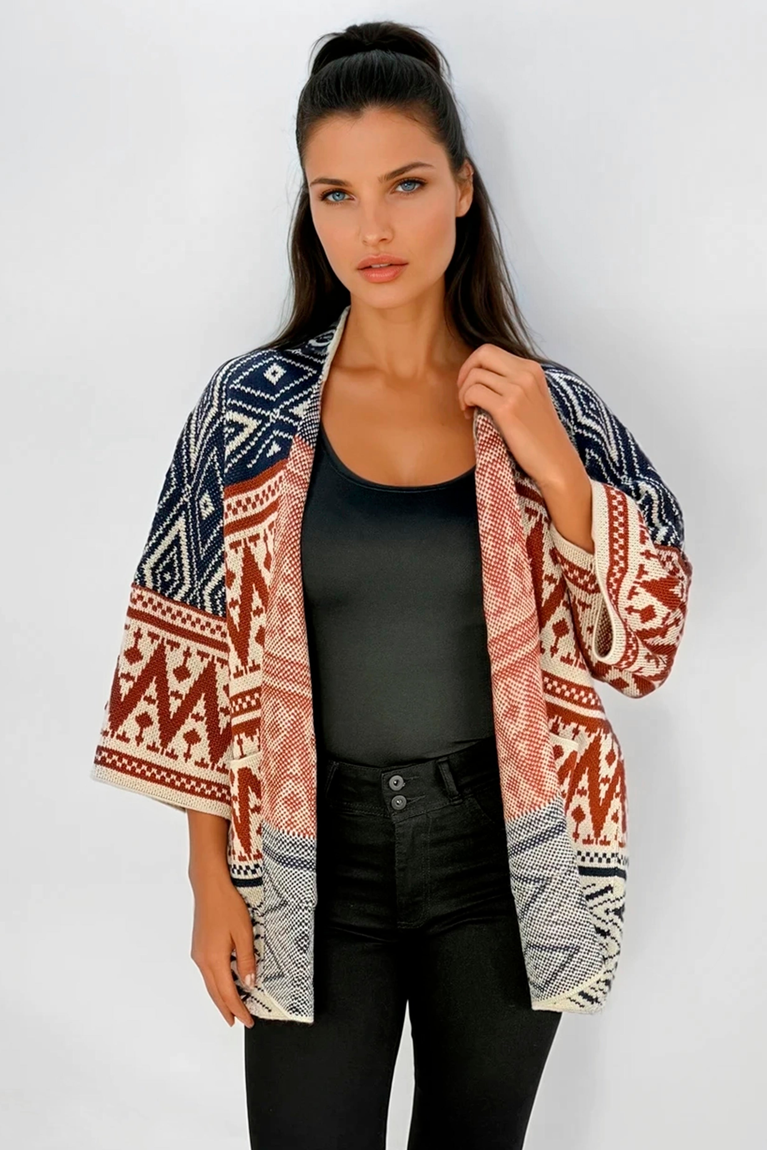 Esta ruana de diseño geométrico es perfecta para sumar estilo y calidez a tus looks, su formato abierto aporta un aire relajado y versátil, se ve muy bien sobre tops básicos y combina fácilmente con jeans o pantalones lisos, logrando outfits cómodos y con mucha personalidad, una ruana CHALIS ideal para usar durante temporadas frescas o de transición y acompañarte con estilo en el día a día.