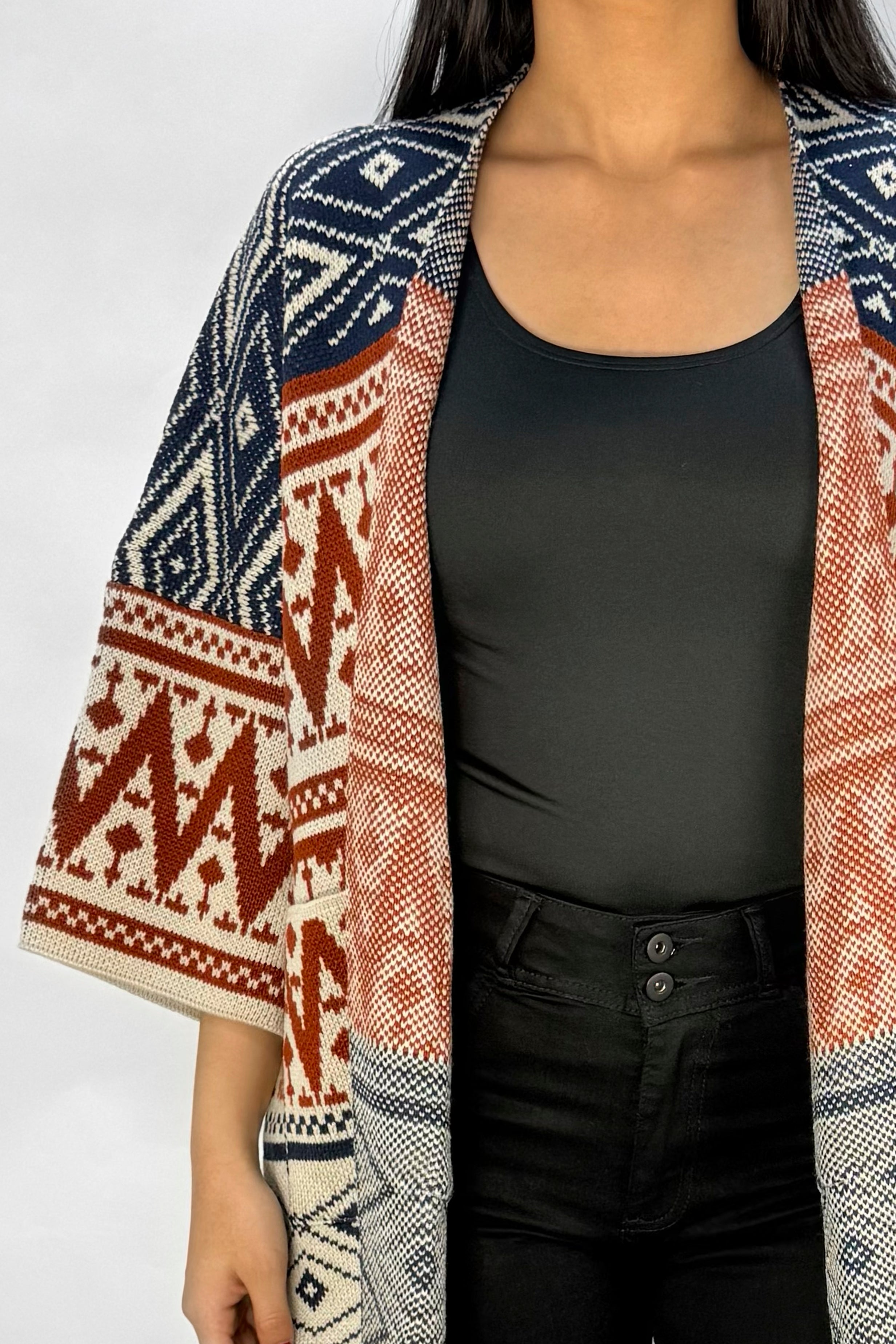 Ruana tipo poncho confeccionada en acrílico, de silueta amplia y abierta al frente. Presenta manga suelta tipo capa, largo a la cadera y diseño geométrico en contraste. No cuenta con botones ni cierres.